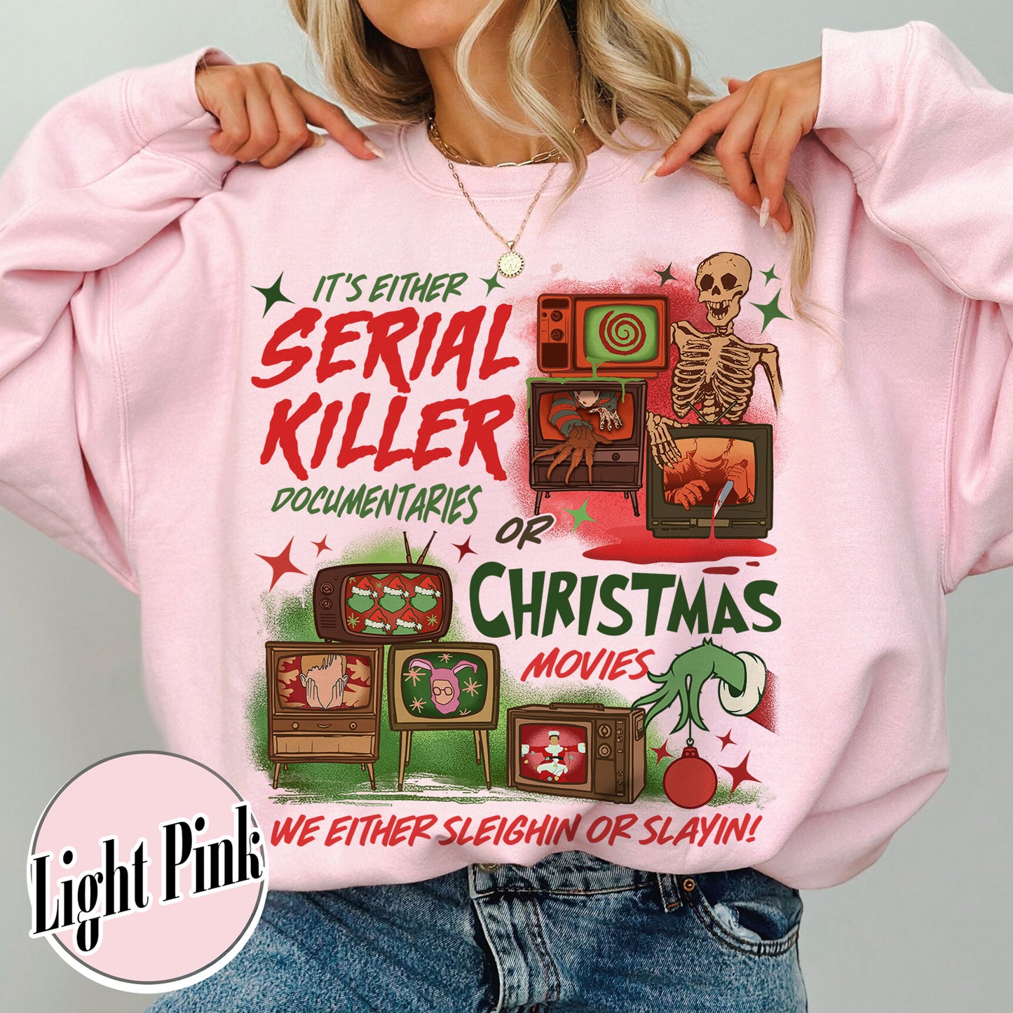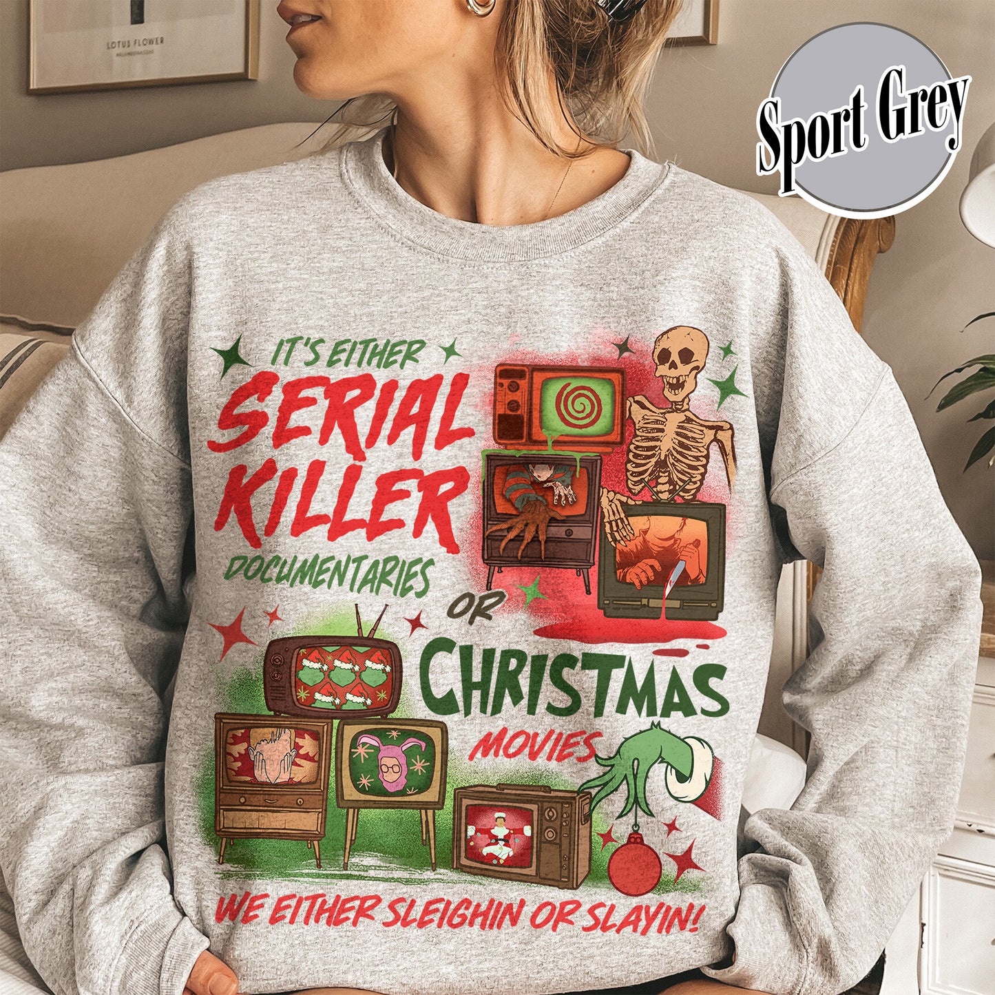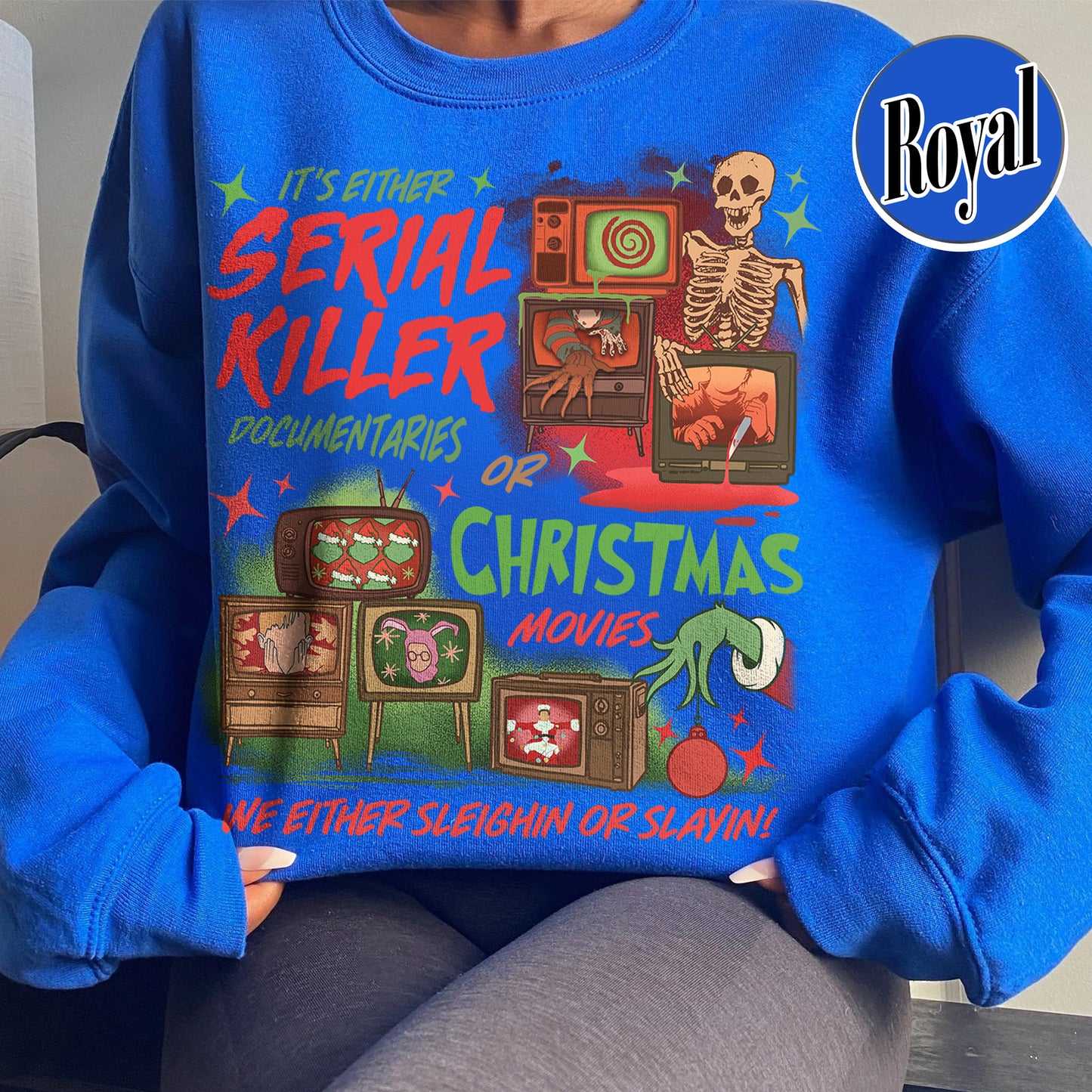 Slaying Or Sleighing Sweatshirt,Horror Christmas Funny Christmas Shirt,Scary Christmas Shirt, Crime Documentaries,Christmas Movies Shirt