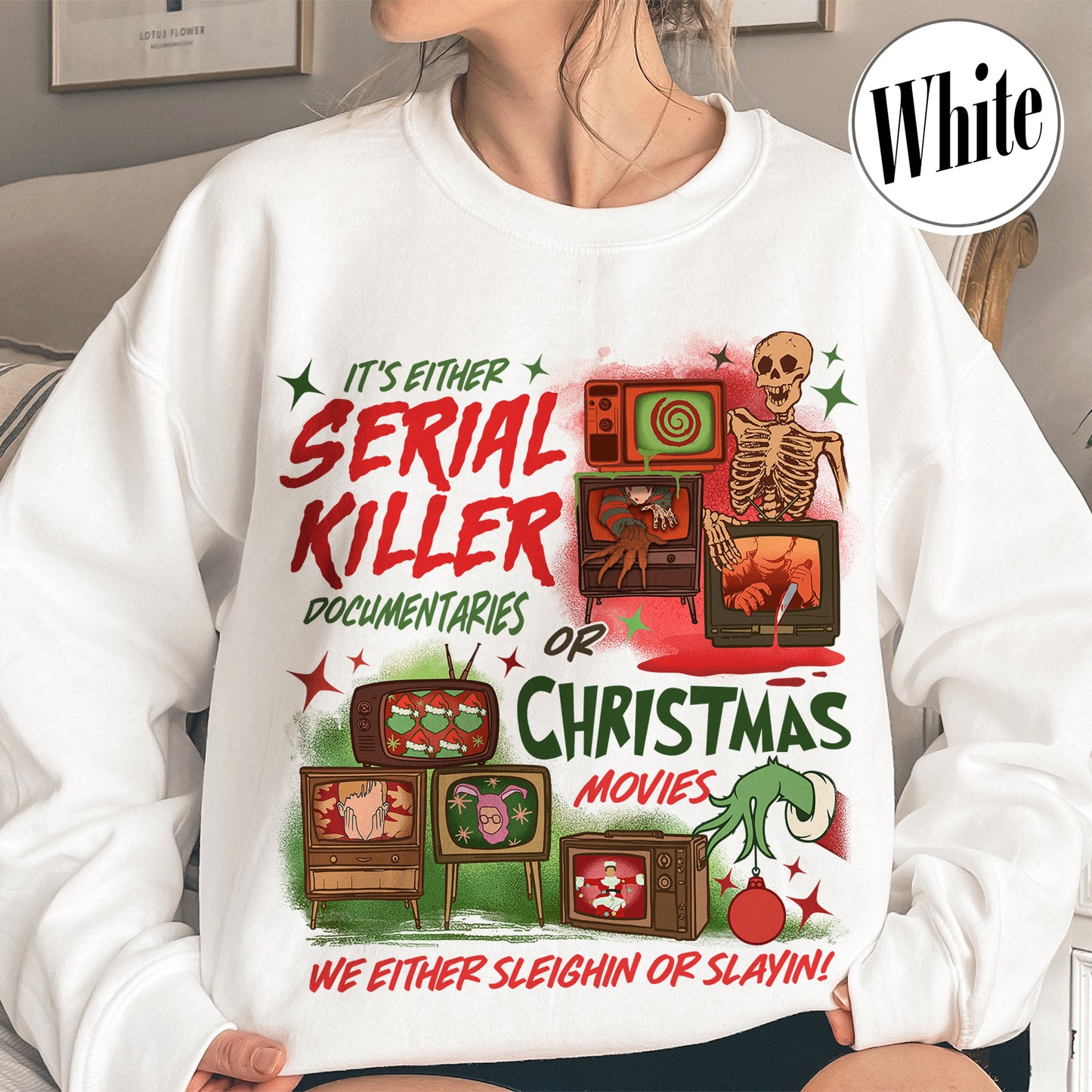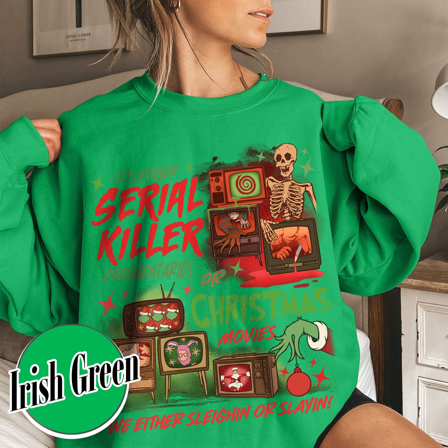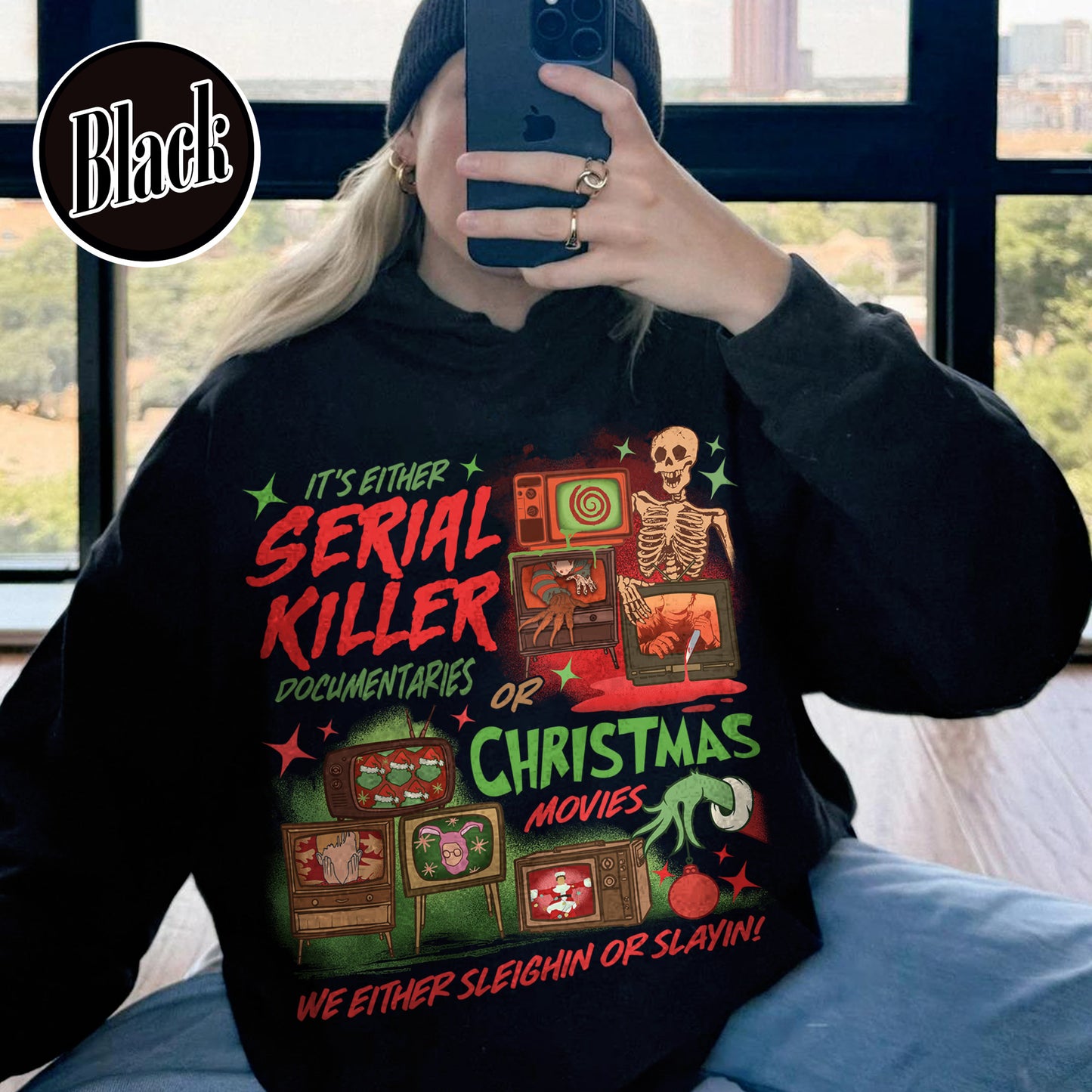 Slaying Or Sleighing Sweatshirt,Horror Christmas Funny Christmas Shirt,Scary Christmas Shirt, Crime Documentaries,Christmas Movies Shirt
